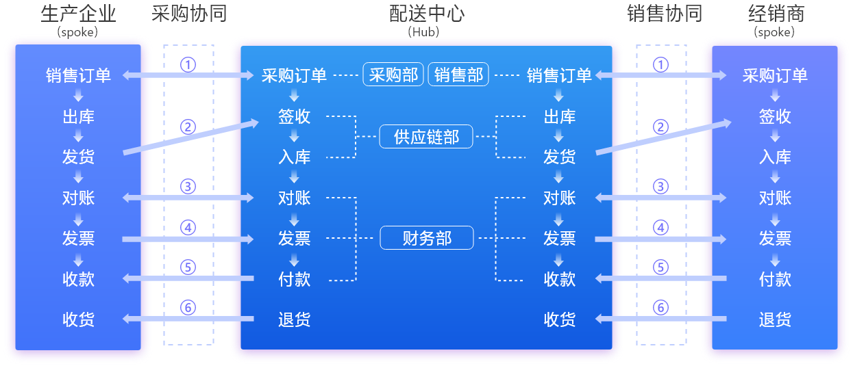 配送中心(Hub)通過上平臺協同業務,實現業務訂單全生命周期管理和數據可視化。同時可以根據上游加工企業(spoke)和下游經銷商(spoke)信息化協同意愿進行場景配置