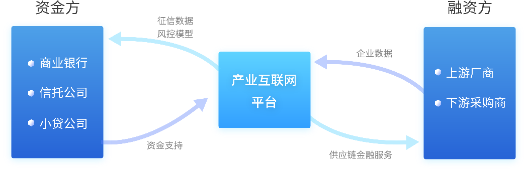 供基于產業聯網運行的真實數據,在金融協同模式下,資金提供方弱化對融資主體的信用以及抵押物要求 ,轉為對供應鏈上的交易狀態進行綜合評價,針對單筆或者多筆交易提供融資服務。產業互聯網平臺基于數 字化供應鏈開展企業融資,能夠有效解決上下游企業在各業務環節中的融資難題,盤活平臺資金,拉動平臺交易額。